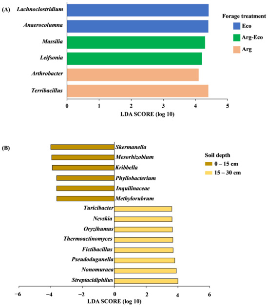 Lefse analysis detected two abundant bacterial genera within each forage treatment, with Lachnoclostridium and Anaerocolumna (Firmicutes) identified in Eco, Massilia (Proteobacteria) and Leifsonia (Actinobacteriota) in Arg-Eco, and Arthrobacter (Actinobacteriota) and Terribacillus (Firmicutes) in Arg (Figure 2A). Fourteen bacterial genera were identified across soil depths, with six in 0 to 15 cm and eight in 15 to 30 cm (Figure 2B). Apart from Kribbella (Actinobacteriota), bacterial genera belonging to Proteobacteria were mainly present at the 0 to 15 cm soil depth and included Skermanella, Mesorhizobium, Phyllobacterium, Inquilinaceae, and Methylorubrum. Bacterial genera identified at 15 to 30 cm soil depth were a mixture of phyla Actinobacteriota (Nonomuraea, Oryzihumus, and Streptacidiphilus), Firmicutes (Fictibacillus, Thermoactinomyces, and Turicibacter), and Proteobacteria (Nevskia and Pseudoduganella).