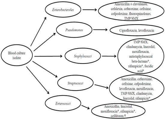 - Thaden, J.T.; Tamma, P.D.; Doi, Y.; Daneman, N. Variability in oral antibiotic step-down therapy in the management of Gram-negative bloodstream infections. Int. J. Antimicrob. Agents 2021, 58, 106451. [Google Scholar] [CrossRef] [PubMed]