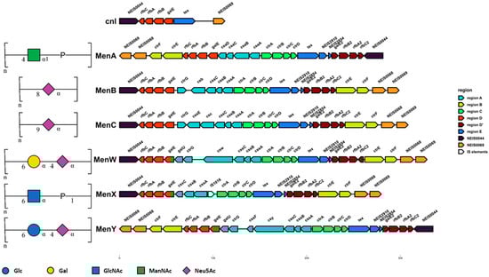 The earliest typing scheme developed for the meningococcus was based on agglutination reactions against the polysaccharide capsule using immune rabbit serum. On this basis, thirteen serogroups were defined, and twelve of these (serogroups A, B, C, E, H, I, K, L, W, X, Y, and Z) were later confirmed and given defined structures using nuclear magnetic resonance spectroscopy (Figure 2) [13]. More recently, whole-genome sequencing allowed the assignment of Nme into genogroups based on the genetic organisation of the cps island, which encodes for capsule synthesis, with each genogroup corresponding to the presumed capsular serogroup. The cps island is organised into six regions: region A, which encodes genes for capsular polysaccharide synthesis; region B, which encodes the capsule translocation system; region C, which is divergently transcribed from region A and encodes for capsule transport proteins; region D, which contains the galE locus important for LOS synthesis; region D’, which is a duplicate copy of region D with a truncated galE2 locus; and region E, which contains the gene of unknown function tex and two methyltransferase pseudogenes [13,14]. Nonserogroupable meningococci do occur and belong to one of two broad groups: those that possess a cps island that has been rendered nonfunctional due to indels or IS element insertion in key capsule synthesis genes or, more commonly, those which lack a cps island entirely. The latter group instead possesses a cnl locus consisting of regions D and E only. Since a capsule is required to cause disease in immunocompetent individuals [15], serogrouping remains an important tool for tracking meningococcal epidemiology.