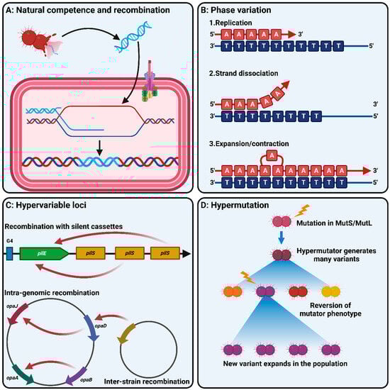 Many of the described mechanisms of variation, including homologous recombination and slipped-strand mispairing, are counteracted by the mismatch repair system. Two components of this repair system, MutS and MutL, are critical for its anti-recombination activity in bacteria. MutS detects DNA mismatches and MutL has endonuclease activity [117]. Loss-of-function mutations in MutS or MutL result in a loss of mismatch repair function and a corresponding increase in the mutation rate of the bacterial cell. Mutants lacking MutSL are known as hypermutators (Figure 3D) and have been identified in multiple bacterial pathogens including Pseudomonas aeruginosa [118], E. coli [119], Burkholderia pseudomallei [120], and Acinetobacter baumannii [121]. Hypermutators play a role in the evolution of bacterial pathogens by rapidly generating diversity through their increased rates of recombination and mutation, allowing the pathogen to more rapidly adapt to challenges such as herd immunity or antibiotic selection [122]. Hypermutators have been observed in both Ngo and Nme and have been associated with outbreaks of IMD [123,124]. Mutation of mutSL is associated with increased phase variation [125], increased pilin antigenic variation [126], and increased variation of surface antigens [127].