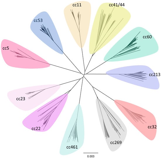 Clonal structure of the meningococcal population. A neighbour-joining phylogeny of 550 N. meningitidis isolates from 11 clonal complexes based on the phylogeny of 1735 core genes. Clonal complexes are each indicated by a different colour. Used with permission from Mullally, Mikucki, Wise, and Kahler [40].
