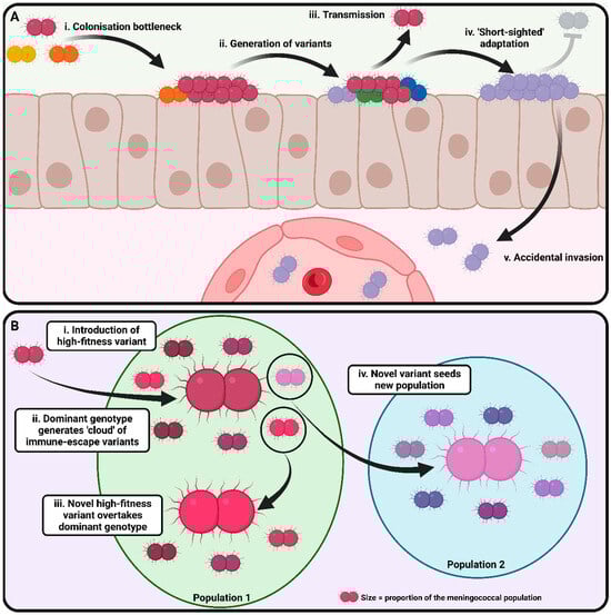 Within-host evolution (WHE) refers to the process in which a bacterial pathogen adapts to colonisation in a given host without regard for the overall transmission fitness of the organism within the host population as a whole (Figure 5A) [140,141]. Under the WHE hypothesis, virulence evolves coincidentally through selection for the colonisation of unoccupied niches such as the intracellular space or the bloodstream [142]. In Nme, WHE is postulated to occur during the initial phases of colonisation and select for variants which successfully evade host immunity and colonise the epithelium but would not be predicted to select for variants with increased fitness in the invasive context.
