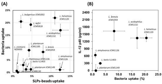 (A) Uptakes of Cy3 labelled surface layer protein A (Cy3SlpA) lactic acid bacteria (LAB) and Slps-coupled microbeads by THP-1 DC. (B) Uptake of Cy3 labelled LAB (Bacterial uptake), and IL-12 production from THP-1 cells by treatments with various LAB strains.