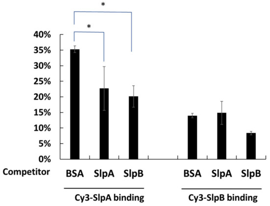 DC-SIGN on THP-1 DC is known to be the receptor for SlpAs and is crucial for the cellular uptake of L. helveticus and L. acidophils [21,22,29]. Mincle is also known as the receptor for the Slps on L. brevis [24]. However, the receptor for SlpB, which is induced on THP-1 DC and is necessary for the binding of L. brevis JCM 1059, has not been elucidated thus far. To confirm the ability of SlpA of L. acidophilus JCM 1132 and SlpB of L. brevis JCM 1059 to share the DC-SIGN receptor, Cy3SlpA and Cy3SlpB were prepared for competitive binding assays. As shown in Figure 4, the binding of Cy3SlpA SlpA to THP-1 DC was significantly inhibited by the addition of 10-fold of both, non-labelled SlpA and non-labelled SlpB. The binding of Cy3SlpA SlpB showed a reduced trend (p = 0.069) with the addition of 10-fold non-labelled SlpB, but not with non-labelled SlpA. These results suggest that SlpB on L. brevis JCM 1059 binds to both, DC-SIGN and other receptors on THP-1 cells.