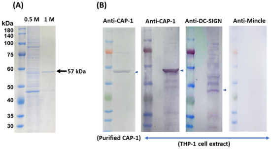 (A) SDS-10%PAGE of the affinity-purified 57 kDa receptor. (B) Western blotting analysis of affinity purified protein with anti-adenylyl cyclase-associated protein 1 (CAP-1) and crude extract of THP-1 cells with anti-CAP-1, anti-DC-SIGN, and anti-macrophage-inducible C-type lectin (Mincle) antibodies.