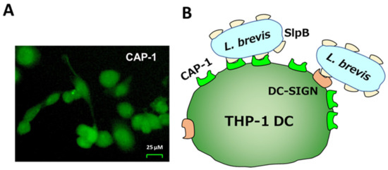 (A) Immunostaining of THP-1 DC with anti-CAP-1 antibody. CAP-1 on THP-1 DC was detected by incubation with FITC-labelled anti-CAP-1 antibody. (B) Illustration for L. brevis JCM 1059 binding of SlpB with CAP-1 and DC-SIGN.