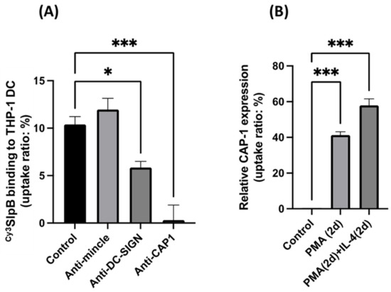 (A) Cy3SlpB was incubated with THP-1 DC with normal mouse serum (Control), anti-Mincle antibody, anti-DC-SIGN antibody, and anti-CAP-1 antibody for 1 h. (B) CAP-1 expression in THP-1 DC differentiated with PMA, and PMA and IL-4 (B). (Means ± SD. * p < 0.05; *** p < 0.001).