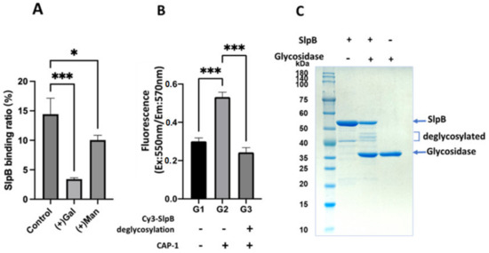(A) Cy3SlpB and THP-1 DC binding with or without galactose (Gal) and mannose (Man). (B) Binding between CAP-1 and Cy3SlpB or glycosidase treated Cy3SlpB. (C) SDS-10%PAGE analysis of SlpB and deglycosylated SlpB. (Means ± SD. * p < 0.05; *** p < 0.001).