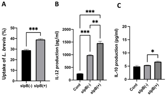 (A) Uptake of L. brevis JCM 1059 (slpB +) and LiCl treated JCM 1059 (slpB-) coating into THP-1 DC. (B) IL-12, and (C) IL-10 production by THP-1 DC after treatment with L. brevis with (+) or without (-) SlpB. (Means ± SD. * p < 0.05; ** p < 0.01, *** p < 0.001).