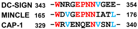 EPN sequence among DC-SIGN and Mincle, and similar sequence in CAP-1 Identical amino acids among 3 sequences were shown in red and between CAP-1 and Mincle of DC-SIGN were in blue.