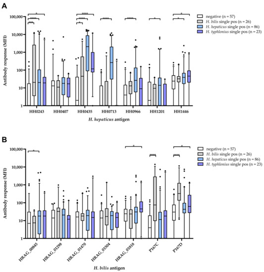 Continuous antibody responses (in MFI) to all H. hepaticus proteins except HH0407 were significantly higher in the H. hepaticus single DNA-positive group compared to the Helicobacter genus DNA-negative group. However, for proteins HH0713, HH0966, and HH1201 only, these antibody responses did not show cross-reactive responses in H. bilis or H. typhlonius DNA-positive mice (Figure 2A).