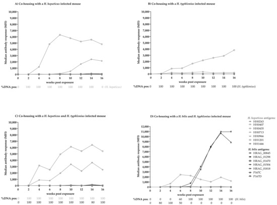 Mice in the H. bilis and H. typhlonius dual-infected group developed antibody responses to HH0435 four wpe and two weeks after the first H. typhlonius DNA detection in feces (Figure 3D). At the earliest, six wpe but also two weeks after H. bilis DNA detection in feces, mice also developed antibody responses to H. bilis proteins P167C and P167D with up to 10,000 MFI at wpe 14 (Figure 3D).