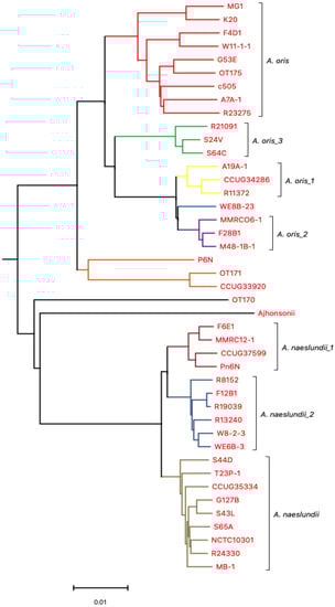 De novo assembled whole genome sequences were used for the alignment of strains using Mauve. The dendogram was generated using whole genome sequences (Figure 1). Genomes of selected Actinomyces spp. were the most divergent. Based on NJ-tree information (Figure 1), the isolates were divided into two main groups. One group composed of A. oris, with six subgroups/subspecies, and the other consisted of A. naeslundii, with three subgroups/subspecies. The A. oris cluster consisted of genomes of MG1, k20, F4D1, W11-1-1, G53E, OT175, c505, A7A-1, and R23275; WE8B-23 is in an independent cluster; A19A-1, CCUG 34286, and R11372 are included in the A. oris_1 cluster; MMRCO6, F28B1, and M48-1B-1 are in A. oris_2 cluster; P6N, CCUG 33920, and OT171 are considered as a separate cluster; and finally, R21091, S24V, and S64C are clustered as A. oris_3. The other main group consisted of A. naeslundii which have isolates grouped in the true A. naeslundii cluster named S44D, T23P-1, CCUG 35334, NCTC_10301, G127B, S43L, MB-1, R24330, and S65A. The A. naeslundii_1 cluster consisted of isolates named F6E1, MMRC-12-1, CCUG 37599, and Pn6N, while F12B-1, R19039, R8152, R13240, W8-2-3, and WE6B-3 were part of the A. naeslundii_2 cluster. OT170 and A. johnsonii were not associated with either group. Figure 1 revealed consistent results with those obtained using an MLST approach [14,17].