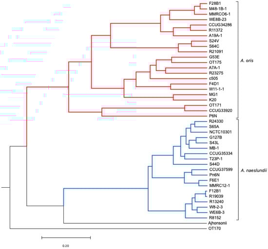 Similarly, when all members of the A. oris (AO) cluster were compared with members of clusters AO_1 to AO_3 and three independent clusters (WE8B-23, P6N, and CCUG 33920), the average homology values observed for AO versus WE8B-23 were 48.8% ± 0.29, AO_1 showed 47.5% ± 0.38, AO_2 gave 48.3% ± 0.30, P6N and CCUG 33920 showed 43.0% ± 0.24, and AO_3 had 47.4% ± 0.28 (Table 1). The DDH values of AO_1 to AO_3 and three independent clusters were in the range of 42.7–49.2% when compared to main AO strains. Therefore, all these clusters are different compared to the main AO cluster (Table 1).
