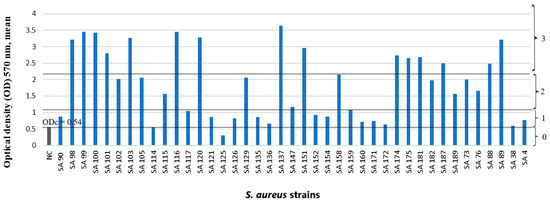 | Biofilms, mean OD | S. aureus biofilms, mean OD | 1.89 | |