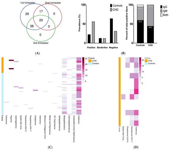 ViroCap was performed in pools of 4–5 plasma samples with 13 pools for CHD, and 35 for Controls (Table S3). The distribution of the viruses detected are presented in Figure 1C. Evidence of at least one pathogenic virus in the maternal circulation was found in 17% of the Controls and 38% of the CHD pools. Of note, CVB was not detected in any pool. Viral sequences from 14 and 8 distinct viruses were identified in the Controls and CHD groups, respectively. Both groups of mothers had common vertebrate-infecting viruses such as anelloviridae, members of the papillomavirus family, cytomegalovirus (CMV), and roseolovirus (HHV-6B and HHV-7). Of note, the distributions of anellovirus and betapapillomavirus were nearly ubiquitous and similar across the groups. These viruses were not subtyped, as we focused on the other viral types, which are more likely to be pathogenic. Viruses only found in plasma of the CHD group were pegivirus and adenovirus. Inversely, enteroviruses (i.e., rhinovirus A) were unique to control pools.