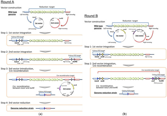 pBS-aphII-loxLE (used for the first vector construction in Round A) was constructed on the basis of pBluescriptII by introducing kanamycin-resistant gene (aphII) from pK18mobsacB and synthesized loxLE sequence (TACCGTTCGTATAGCATACATTATACGAAGTTAT) [57]. pACYC-aac-loxRE (used for the second vector construction in Round A) was constructed on the basis of pACYC184 [58] by introducing apramycin-resistant gene (aac(3)IV) from pHN1237 [59], synthesized loxRE sequence (ATAACTTCGTATAGCATACATTATACGAACGGTA) [57] and by deleting the tetracycline-resistant gene. pTip-sacB-cre (used as the third vector in Round A) was constructed on the basis of pTip-QC2 vector (E. coli-Rhodococcus shuttle vector [44]) by introducing sacB gene from pK18mobsacB and Cre recombinase gene (cre). The cre gene was placed under the regulation of thiostrepton-inducible Tip promoter [44]. pK18mobsacB-loxLE (used for the first vector construction in Round B) was constructed by introducing loxLE sequence into pK18mobsacB. pCH-cre-loxRE (used for the second vector construction in Round B) was constructed by ligating p15A ori from pACYC184, thiostrepton-inducible protein gene (tipA) and thiostrepton-resistant gene (tsr) from pTip-QC2, aac(3)IV, cre, and thiostrepton-inducible CH2.2 promoter from pTip-CH2.2 [41]. The cre gene was placed under the regulation of CH2.2 promoter. For each deletion target, the first vector was constructed by ligating an upstream flanking part of deletion target region (left homolog, approximately 3 kb), whereas the second vector was constructed by ligating a downstream flanking part of the deletion target region (right homolog, approximately 3 kb) (Figure 2).