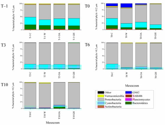Percentage contribution of bacterial phyla (>0.2 μm fraction) in the mesocosms at T–1, T0, T3, T6 and T10. “Other” phyla include Acidobacteria, Chlorobi, Chloroflexi, Firmicutes, Gemmatimonadetes, NC10, Nitrospirae, Spirochaetes and ZB3. C: control mesocosms, W: mesocosms where the temperature was increased by 3 °C (labeled after warming), OA: mesocosms where the pH was decreased by 0.3 units (labeled after ocean acidification), GH: mesocosms where the temperature was increased by 3 °C and the pH was decreased by 0.3 units (labeled after greenhouse).