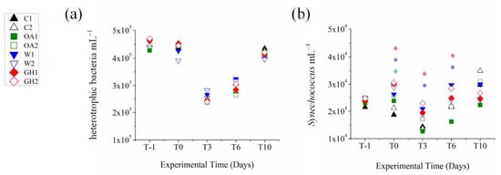 The abundances of (a) heterotrophic bacteria (cells mL−1) and (b) Synechococcus (Synechococcus, cells mL−1) in the mesocosms at T–1, T0, T3, T6 and T10. Colored asterisks above symbols denote significant differences from the controls. For the treatment abbreviations, please refer to Figure 1.
