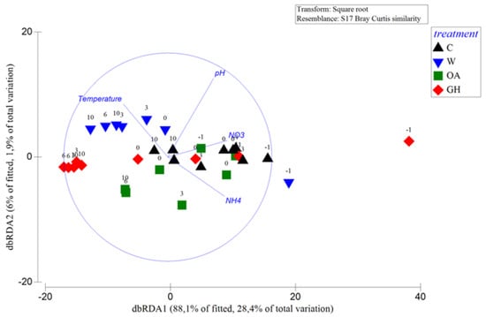 Distance-based redundancy analysis (dbRDA) plot of the distance-based linear model of the pH and temperature measurements and the concentrations of nitrate (NO3-) and ammonium (NH4+) fitted to the bacterial community composition (genus level). The length and direction of the vectors indicate their relative strength and direction of relationship in the ordination plot, respectively. Community similarity was calculated via the Bray–Curtis index after a square–root transformation of the bacterial genera read counts. The samples are presented based on the mesocosm treatment (symbols) and experimental day (numbers above symbols). For the treatment abbreviations, please refer to Figure 1.