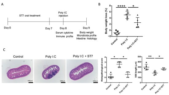Streptococcus thermophilus strain 7 (ST7) treatment prevents small intestine injury induced by polyinosinic-polycytidylic acid (poly I:C). (A) Timeline of the ST7 experiments. The mice received ST7 orally for 7 days. On day 8, they were intraperitoneally injected with poly I:C for 2 h, and then their sera, spleens, and lymph nodes were harvested to examine the cytokine and immune cell activation profiles. Data pertaining to weight, microbiota, and intestinal histology were collected 24 h after poly I:C stimulation. (B) Quantification of the percentage of weight loss in mice treated with poly I:C and poly I:C + ST7. n = 5, * p < 0.05. **** p < 0.0001. (C) Representative photographs of H&E-stained paraffin-embedded sections from mice treated with poly I:C and poly I:C + ST7. The histopathological scores and villus-to-crypt ratios were quantified in the graph. n = 5, * p < 0.05, ** p < 0.01.