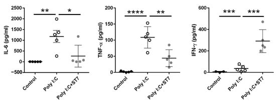 We next evaluated the systemic inflammation level by determining the serum inflammatory cytokine levels. The intraperitoneal administration of poly I:C increased serum IL-6 and TNF-α levels (Figure 2), and these levels were substantially low in the ST7 treatment group (poly I:C + ST7). IFN-γ levels were also considerably increased in the poly I:C group. Notably, ST7 treatment synergistically increased the serum IFN-γ level (Figure 2).