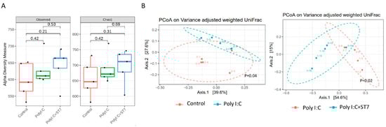 ST7 treatment modulates the distribution of the fecal microbiome after poly I:C stimulation. Fecal microbiome profiling was performed using high-throughput sequencing of the 16S ribosomal ribonucleic acid gene. (A) Alpha diversity of fecal microbiota and (B) principal coordinate analysis plots (obtained using variance-adjusted weighted UniFrac analysis) for the control, poly I:C, and poly I:C+ST7 mice. Permutational multivariate analysis of variance (vegan::adonis, 1000 permutations) revealed a considerable difference in beta diversity, which was quantified using the betadisper function (vegan::betadisper, 1000 permutations). Both adonis and betadisper indices yielded p values of <0.05 and >0.05, respectively.