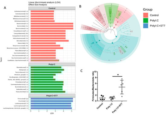 ST7 treatment alters the microbiota profile after poly I:C stimulation. (A) Linear discriminant analysis (LDA) for comparing the gut microbiota effect sizes of the control, poly I:C, and poly I:C+ST7 mice. Strong biomarkers were defined as taxa with an LDA score (log10) of ≥2. (B) Substantial taxa differences in the control, poly I:C, and poly I:C+ST7 mice are highlighted on the cladogram. (C) Ratio of Firmicutes to Bacteroidota in the control, poly I:C, and poly I:C+ST7 mice. * p < 0.01.