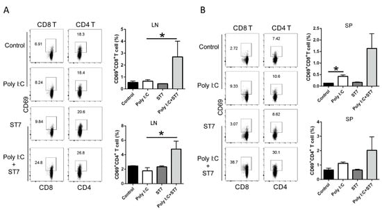 ST7 treatment promotes the activation of T cells after poly I:C stimulation. (A) The expression of CD69 by CD8+ T and CD4+ T cells in the mesenteric lymph nodes (LNs) and (B) spleen (SP) after 2 h of poly I:C stimulation was analyzed using flow cytometry. The percentages of CD69+CD8+ T and CD69+CD4+ T cells in LNs and SP are depicted as bar graphs. Data are presented as mean ± standard error of the mean (SEM). n = 5 per group, * p < 0.05.