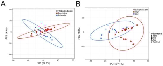 Principal component analysis of all detected Breviolum minutum proteins. (A) Contrasting algae in hospite with the sea anemone Aiptasia versus free-living cells; (B) high (i.e., well-fed in hospite or cultured in replete f/2 medium) versus low nutritional regimes, meaning starved in hospite or cultured in artificial seawater (ASW). Ellipses represent 99% confidence intervals.