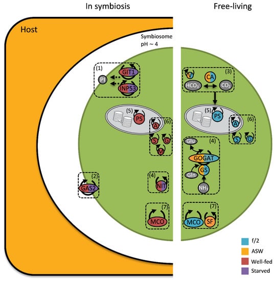 Conceptual diagram of the cellular processes under varying degrees of B. minutum compatibility. Coloured proteins were significantly more abundant in the colour-coded treatments. Grey = metabolites/solutes; Purple = Starved; Red = Well-fed; Orange = ASW; Turquoise = f/2. (1) Proteins involved in phosphoinositol (PI) manipulation, including GIT1 and INP53 were more abundant only in hospite, potentially for preventing host autophagy, and aiding communication and cell recognition. (2) Cell wall modification proteins (e.g., GAS2) were increased in symbionts regardless of nutritional state. (3) B. minutum carbonic anhydrase (CA) and vacuolar proton pumps (V), which work in harmony to convert bicarbonate ions (HCO3-) to carbon dioxide (CO2), were abundant in both free-living treatments. CO2 can be further used for photosynthesis. Upregulation of algal CAs and V-Type ATPase in the free-living state might be a response to a lack of readily available CO2 provided by the host CAs and proton pumps when in hospite. (4) Ammonium is assimilated by B. minutum via the GS/GOGAT pathway; however, proteins associated with this pathway increased only in the free-living state, likely because the host controls the flow of nitrogen to its symbionts when in hospite. Moreover, nitrilase (NIT), which is involved in hydrolysing nitrile compounds for ammonia, only increased in abundance when in hospite, possibly as a response to nitrogen limitation inside the host. (5) Photosystem (PS) I and II proteins involved in light harvesting, as well as chloroplastic electron transport proteins, were highly increased in abundance in the nutrient-enriched treatments (i.e., Well-fed and f/2). (6) Proteins involved in B. minutum antioxidant mechanisms such as ascorbate peroxidase (A), superoxide dismutase (S), and glutathione s-transferase (G) were more abundant in high nutrient treatments (i.e., Well-fed and f/2), potentially as a cellular response for maintaining high rates of photosynthesis/respiration. Moreover, metacaspase-1B (M), which is involved in oxidative stress and apoptosis, was only abundant in the well-fed treatment in hospite. (7) Nutrient usage, such as for iron, was affected by nutrient regime. Multicopper oxidase (MCO), which is involved in the iron uptake pathway, increased in abundance in the high nutrient regimes. Moreover, soma ferritin (SF), an important iron storage protein, was more abundant in the ASW treatment.