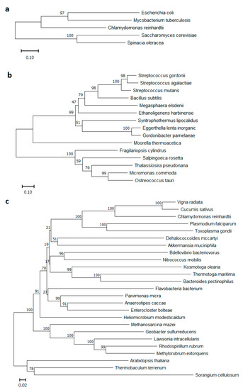Phylogenetic trees of (a) soluble PPases Family I, (b) soluble PPases Family II, and (c) membrane-bound PPases protein sequences. Phylograms were generated using NJ analysis (MEGA software, https://www.megasoftware.net/, accessed on 23 December 2022), and multiple sequence alignment was performed by Muscle [3]. Bootstrap values of 1000 replicates are shown in percentages at the internodes. Scale bars 0.1 for (a,b), and 0.02 for (c) substitutions per residue are indicated.