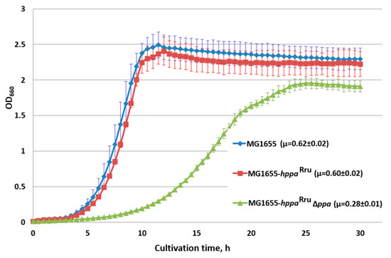 Growth of strains with the hppaRru gene in the presence and absence of E. coli ppa. Cells were grown with aeration in L-tubes with M9 minimal medium supplemented with 0.3% of glucose at 37 °C in an Advantec photorecorder. MG1655, MG1655 wild-type; MG1655-hppaRru, MG1655 IS5.8::PL-hppaRru; MG1655- hppaRru ∆ppa, MG1655 IS5.8::PL-hppaRru ∆ppa. Average data are shown; bars refer to standard deviations from three independent experiments.
