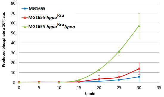 The analysis of the time course of IMV-associated phosphate production (Figure 5) showed that the membrane pyrophosphatase activity in the IMVs of the strain where native S-PPase was replaced with H+-PPaseRru was about 10-fold higher compared with the IMV-associated activity in the wild-type strain (Figure 5). Thus, the obtained result supports the assumption that H+-PPaseRru is capable of acting as a sole PPi-hydrolyzing enzyme in E. coli. Interestingly, an unexplainably low rate of pyrophosphatase activity was detected in IMVs of the strain containing both types PPases, soluble and membrane-bound. At present, the reason underlying this effect is not clear and requires further elucidation. For the wild-type strain MG1655, a small but detectable PPase activity was observed. This indicates that the possibility of contamination of IMV preparations with S-PPase cannot be completely excluded in these experiments. Similar contamination was observed in the work of Belogurov et al., where the heterologous expression of fully functional H+-PPaseRru in E. coli cells was reported for the first time [10].
