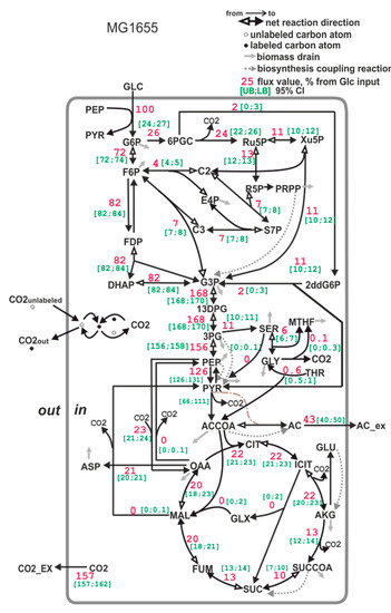 The fructose-1,6-bisphosphatase and phosphoenolpyruvate synthetase reactions were added to the model, as cells grown on glucose minimal medium possess these enzymes [43,44,45]. The energy-consuming futile cycles composed of reactions catalyzed by these two enzymes and by corresponding partners, such as 6-phosphofructokinase or pyruvate kinase reactions [46,47,48,49], can affect the central metabolism of the cells [50]. Two alternative pathways for acetate synthesis were considered: first, acetate synthesis from acetyl-CoA via reversible reactions of the phosphate acetyltransferase and acetate kinase and, second, acetate synthesis from pyruvate via an irreversible pyruvate oxidase reaction. Both pathways are known to be active in E. coli [51,52,53]. Accounting for both pathways for acetate synthesis may affect the accuracy of the pyruvate dehydrogenase (PDH) flux estimation. Thus, the PDH flux was characterized by an interval in which the lower boundary was limited by the acetyl-CoA requirement for biomass synthesis and the upper boundary was determined under the assumption that all secreted acetate is synthesized from acetyl-CoA.