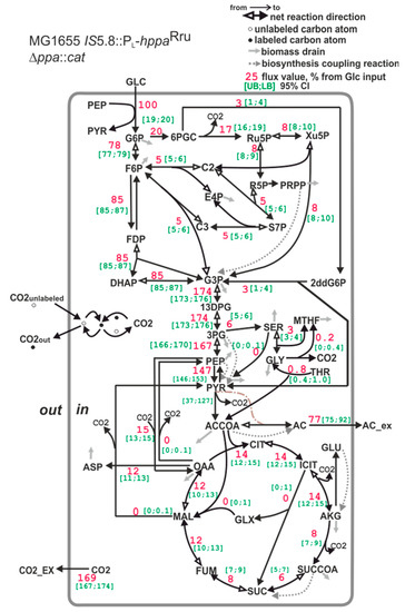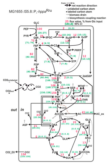 Atom transition schemes were extracted from the literature [58]. The measured external carbon fluxes (effluxes) were biomass synthesis, efflux of secreted acetate, and the glucose uptake rate.