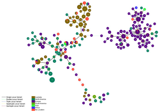 Genomes sequenced in this study and assembled from the SRA database, were screened against the Janßen et al. [20] MLST scheme using mlst v.2.19.0 [34] with novel alleles output using the ‘-novel’ flag. Novel alleles were assigned new identifiers, and the MLST scheme was updated to incorporate all novel alleles. Lastly, mlst was run with all isolates against the updated MLST scheme to determine sequence types (ST) for each isolate. A minimum spanning tree (MST) was then computed in PHYLOViZ Online [35] with the goeBURST full MST function.