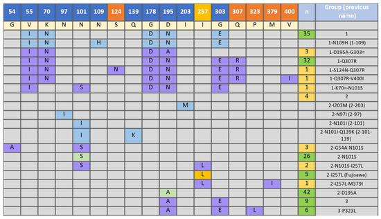 Adapted figure from Forde et al. showing discriminatory amino acid positions within the SpaA protein’s hypervariable region of E. rhusiopathiae. Variant positions and amino acids are relative to the Fujisawa reference sequence and are shown in the first and second rows, respectively (except position 257). Positions in orange represent novel positions observed in this study, while position 257 represents a variant position only previously observed as a variant in the Fujisawa reference genome (L). Previously reported groups and variant positions by Forde et al. are shown in blue, the variants 2-D195A and 2-N101S previously identified by Uchiyama et al., 2016 [42] and Janßen et al., 2015 in light green. Novel groups and their variants are shown in purple. The number of isolates from this study are shown for each group, in green for groups with >5 isolates and yellow for groups with <5 isolates.