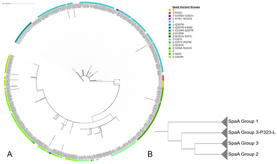 (A) RAxML maximum likelihood phylogeny of SpaA protein sequences over the hypervariable region from AA residues 30-413. (B) Collapsed branches ignoring branch length of the same SpaA tree showing the divergence of the groups 1, 2, 3 and 3-P323L.