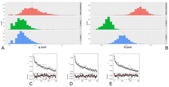 Recombination rates in E. rhusiopathiae were investigated using mcorr from Panaroo core-gene alignments. Three separate clades were investigated based on the core-gene phylogeny and previously reported clades 2 and 3 [1,4]: (1) European isolates of clade 2; (2) the Australian grouping of isolates within clade 3; (3) clade 3 isolates excluding the sub-clade of Australian isolates. Recombinational divergence was observed to be higher in the clade containing Australian isolates based on the ϕpool results of mcorr. In the Australian clade, over 1000 bootstrap replicates had a mean ϕpool value of 0.431 compared to mean ϕpool values of 0.219 and 0.256 for clades 2 and 3, respectively (Figure 5A), each displaying significantly (p < 0.001) different recombinational divergence profiles from each other using Welch’s t-tests. Mutational divergence, θpool, was also observed to be twice as high in Australian isolates (0.129) in comparison to Clades 2 (0.063) and 3 (0.095) with all groupings displaying significantly different (p < 0.001) mutational divergence profiles with Welch’s t-tests (Figure 5B). Monotonic decay of correlation profiles as a function of loci l bp apart also suggest the presence of recombination (Figure 5C–E), whereas in the absence of recombination the value of P(l) would be constant.