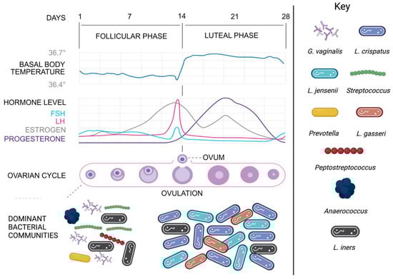 Vaginal CSTs are also known to shift during menses, before reverting to their original states later in the menstrual cycle (Figure 1) [,]. There is evidence to suggest that menses is accompanied by increases in alpha diversity along with a decrease in the abundance of Lactobacillus spp. []. Srinivasan et al. [] reported that the relative abundance of Gardnerella vaginalis and L. iners increased during menses and was accompanied by reduced quantities of L. crispatus and L. jensenii. After menses, the relative abundance of G. vaginalis and L. iners decreased and there were simultaneous increases in the relative abundance of L. crispatus and L. jensenii []. Estrogen levels peak prior to ovulation and in the luteal phase of the menstrual cycle []. The luteal phase is more stable in terms of microbial composition which correlates with the higher circulating concentrations of sex hormones such as estrogen and progesterone []. Multiple studies have reported consistent findings of Lactobacillus-depletion during menses when estrogen levels are lowest, with a shift towards Lactobacillus-dominance just prior to ovulation when estrogen levels are highest [,,,]. This is consistent with the idea that the vaginal microbiome appears to be less stable during menstruation. It is important to note, however, that a recent study by Chaban et al. [] that followed 27 reproductive-aged women throughout a single menstrual cycle found that the vaginal microbiomes of women remained relatively stable, with minimal variations in diversity and richness. However, only one-quarter of participants provided vaginal samples during menses, which may explain these discrepant results. Future, larger studies following women through a greater number of menstrual cycles are required to validate these findings.