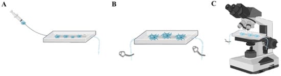 Schematic representation of flow cell apparatus. (A) Acanthamoebae are added to the flow cell apparatus. (B) Once amoebae have filled the flow cell, the ports are clamped to prevent further fluidic movement. (C) The flow cell is attached to the microscope stage for the duration of the experiment to prevent physical interference with Acanthamoeba motility.