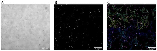 Representative images of the track analysis process. (A) Bright-field microscope image taken in original grayscale. (B) Same image converted to binary, where Acanthamoebae appear as white organisms on a black background. (C) Same image with selected tracks shown (not all tracks present), where ImageJ has assigned a unique color for each individual track. Magnification = 4×, scale bar = 500 um.