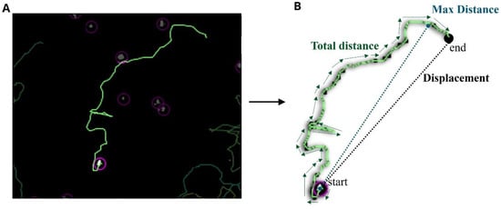 Representative image of track algorithms. (A) Original tracked image. (B) Representative parameters describing how total distance, max distance, and displacement are determined.
