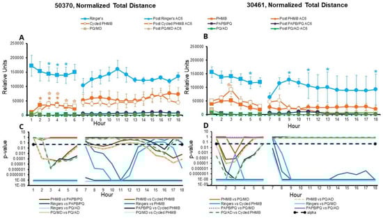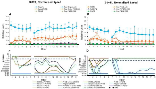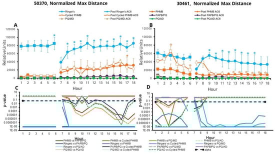 When examining the total distance traveled, amoebae in the one-quarter Ringer’s solution traveled significantly farther in any hour compared to those in the CLCs in both amoeba strains tested (p < 0.05, Figure 4, Figure S2A,B), as expected, with a few exceptions being noted for comparisons between one-quarter Ringer’s solution and either PHMB or cycled PHMB. Other significant results include: