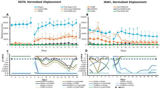 With the ATCC 50370 strain, in one-quarter Ringer’s solution there was significantly greater displacement than in all CLCs throughout the experiment, except for in cycled PHMB at hour 7.