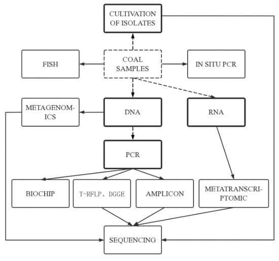 The research on coal seam geological microorganisms in China has mainly focused on the screening and isolation of anaerobic bacteria, enrichment cultures, and experimental simulation of biogenic gas. Initially, the number and distribution of microorganisms in a coal seam were mainly counted by the traditional isolation and culture method: the most probable number counting method [33]. With the progression of experimental techniques in microbiology, scholars in China began to use microbial molecular ecology methods to study the community characteristics and diversity of microorganisms. The main microbial molecular ecology techniques currently applied to study coalbed microorganisms are 16S rRNA gene library analysis, fluorescence in situ hybridization (FISH) and high-throughput sequencing.