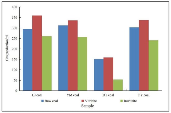 - Type of organic matter. The organic matter type is closely related to the production of biogenic CBM. Different types of organic matter have different properties and are used by microorganisms with different degrees of ease. Among the organic matter types used to generate biogenic gas, humic parent material in coal is the most easily degraded by microorganisms [76]. Semi-humic and herbaceous humic organic matter can provide the carbohydrates, such as cellulose, hemicellulose, sugars, and starch, needed for microbial metabolism, which promotes biogenic CBM production [54]. Hydrogen-rich, oxygen-rich organic matter also facilitates the production of biogenic CBM. Wang et al. [77] studied the Lu Liang Basin and found rich organic matter, and discovered that the organic matter composition of its Neoproterozoic gas source rock contains more type II casein, which is rich in protein and lipid-like compounds and has great potential for biogenic CBM. Zhang et al. [78] found that the biogenic gas reservoirs of the Sanjiang Basin are also dominated by type II organic matter. Meanwhile, many scholars have studied the hydrocarbon generation capacity of maceral components and found that different maceral components have different hydrocarbon generation capacities. Liu et al. [79] made a systematic study of the gas production characteristics of different maceral and their effect on gas production using thermal simulation experiments, showing that the main gas-producing microfractions were vitrinite and the exinite. Furthermore, with the increase in temperature, the ability of vitrinite to produce methane was higher than that of exinite, while the gas production rate of fusinite was very low. As shown in Figure 3 [80,81], our scholars selected lignite, long flame coal, gas coal, and fat coal produced from LiangJia coal mines, YiMa coal mines, DaTong coal mines, and PanYi coal mines as experimental samples, and found that the main maceral components of gas production were vitrinite/huminite in the biogenic CBM simulation output experiments, while the highest gas production was found in vitrinite/huminite in coal, followed by raw coal, and the lowest production was in exinite/liptinite.