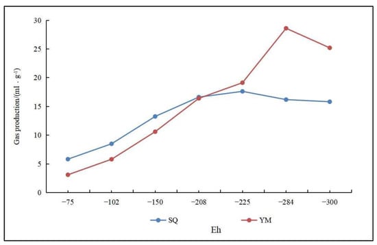Figure 5. The relationship between Eh and gas production (Adapted from [106,107]). (The coal samples of ShaQu coal mines and YiMa coal mines are abbreviated as SQ and YM, respectively, in Figure).