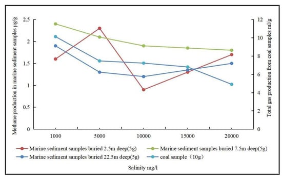 - Salinity. Salinity has an effect on biogenic CBM production and the activity of methanogenic archaea. Biogenic CBM simulation experiments using low-rank coal as a substrate showed that the activity of methanogenic archaea was restricted with increasing salinity, thereby inhibiting methane gas production, and the corresponding decrease in gas production became obvious with increasing salinity [101]. In contrast, biogenic CBM simulation experiments using seafloor sediments showed that the effect of salinity variation on CH4 production was not significant (Figure 6) [102]. Other studies have also shown that increasing salinity causes a decrease in methane production and a lower methane concentration generated by anaerobic coal fermentation, which is not conducive to biogenic CBM production [108,109].